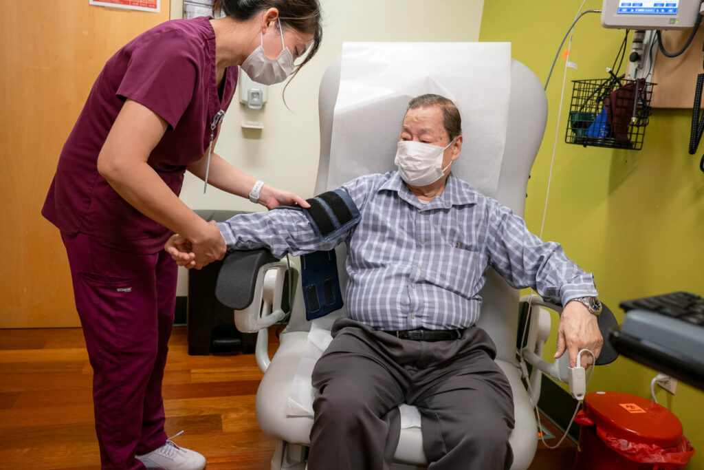 ICHS Lead Medical Assistant Anh Nguyen fits a blood pressure cuff on a patient, April 18, 2025. (Photo provided by ICHS)