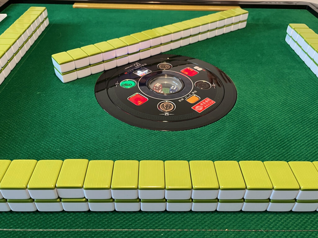Clack, click, go the tiles into the opening at the center of the green felted table. Back down comes the glossy circular control panel. Through slotted compartments of exactly the right size rise rows of tiles, pre-stacked, and with the signature characters, images, and numbers on the other side. The requisite four players, one on each side, are poised on the edges of their seats.