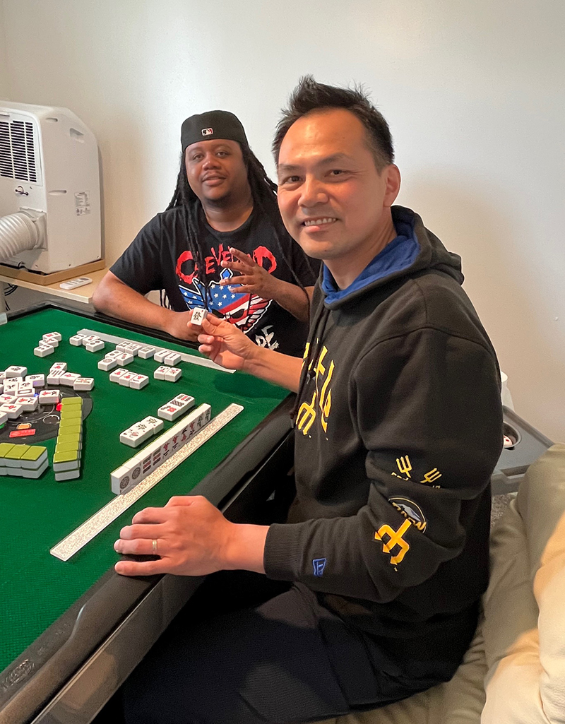 During a weekend session, Jason Liu (right) teaches mahjong to newcomers including Ernest Williams II. Photo by Kai Curry.