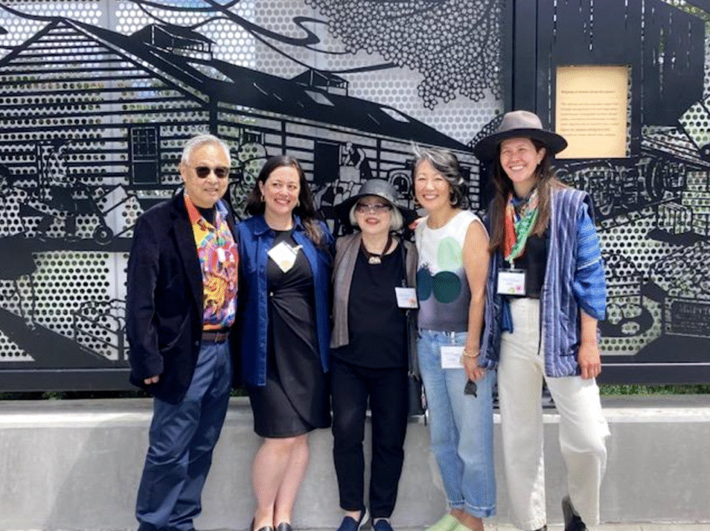 Aki Sogabe mural at Wilburton Station. From left: Larry Matsuda, Lauren Iida, Aki Sogabe, Erin Shigaki and Mari Shibuya (Photo provided by Larry Matsuda)