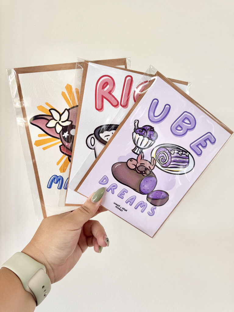 Shaina Estadilla created a special collection of art featuring Filipino foods paired with the adorable “Winnie” or Winston the French Bulldog. (Photo courtesy of Shaina Estadilla and Winnie Shine Designs)
