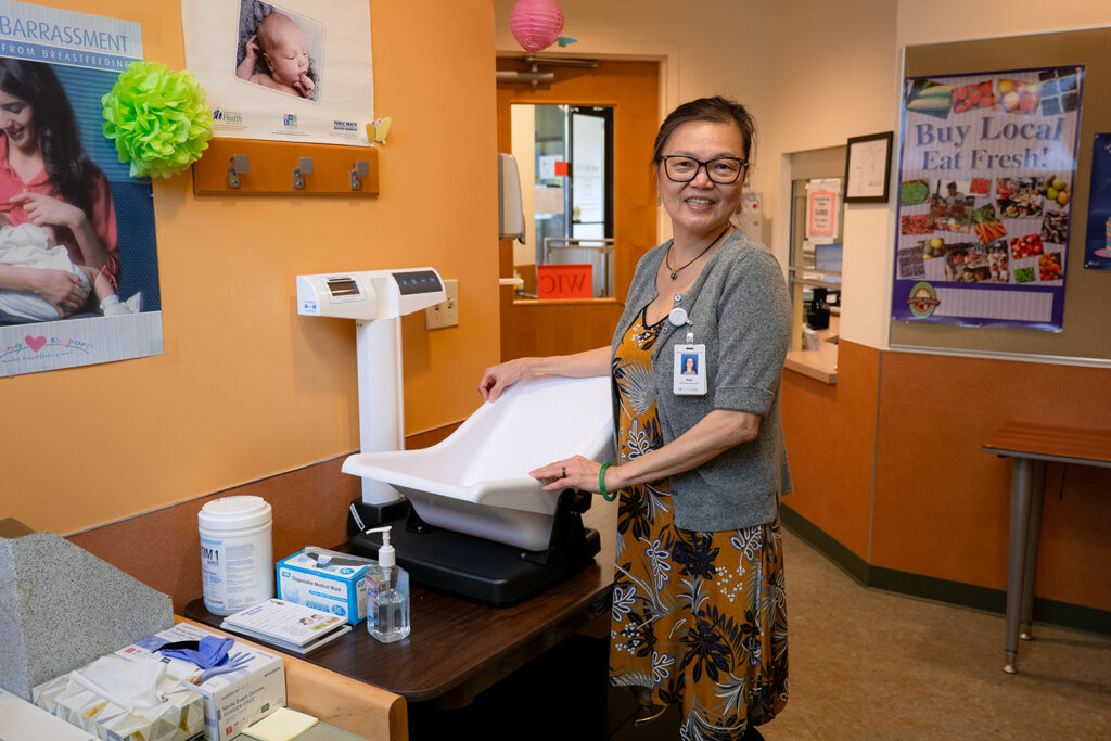 Phan Truong, Nutrition Assistant at ICHS Holly Park Medical & Dental clinic, shows the baby weighing scale in the Women, Infants & Children (WIC) office on the ground floor of ICHS’ clinic in the Othello, Seattle neighborhood. (Courtesy of ICHS)