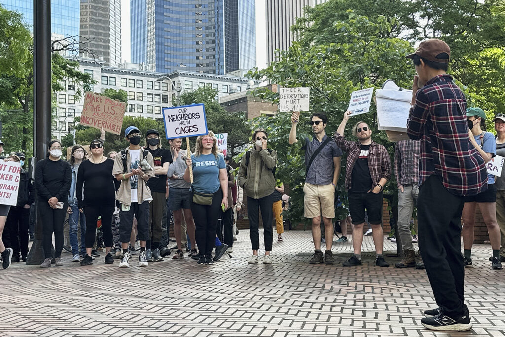 People gather outside immigration court in downtown Seattle on Tuesday, June 10, 2025, chanting with drums and holding up signs reading, “Free Them All Abolish ICE,” and “No to Deportations,” in solidarity with the protesters in Los Angeles voicing opposition to ICE arrests. (AP Photo/Martha Bellisle)