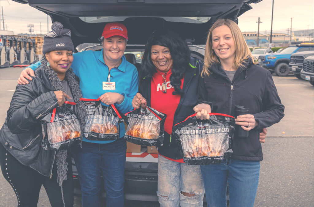 This year’s donation included 450 hot roasted chickens prepared by Costco in a pre-dawn order arranged by MG2 Architecture. Deli manager Rachelle Hedington said staff begin cooking at 4 a.m. so the order is ready for volunteers to pick up by 9 a.m.