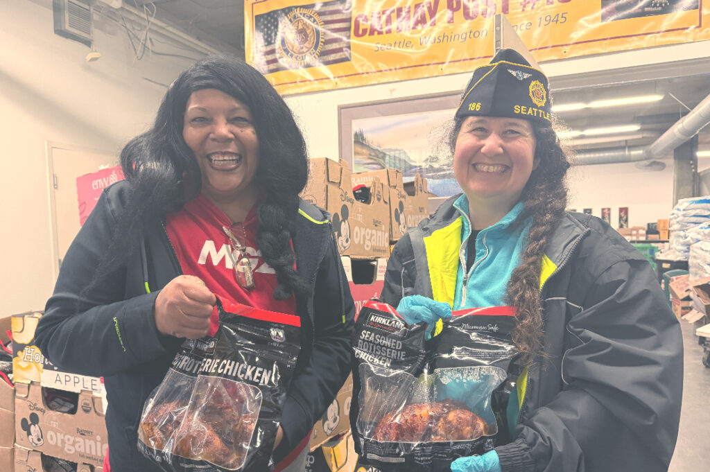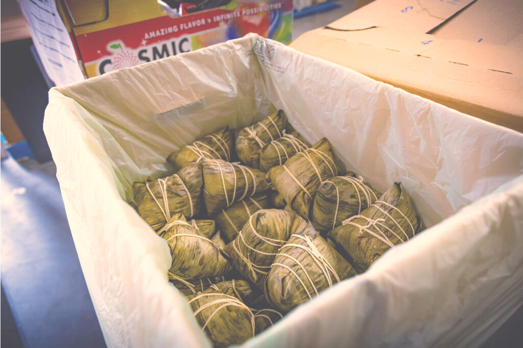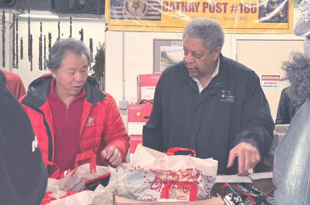 American Legion Cathay Post 186 contributed 450 sticky-rice dumplings, or zongzi, made by Joey Wang of Ton Kiang Barbecue Noodle House. Harry Chan, owner of Tai Tung Restaurant, provided hot congee for people waiting in line. The Seattle Chinese American Citizens Alliance donated 100-pound bags of rice to be packaged with other food bank items.