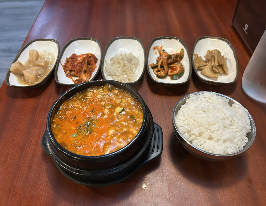 At Seoul Tofu & Jjim, meals are served traditionally with multiple kinds of kimchi, a kimchi stew, and more. (Photo credit: Annika Hauer)