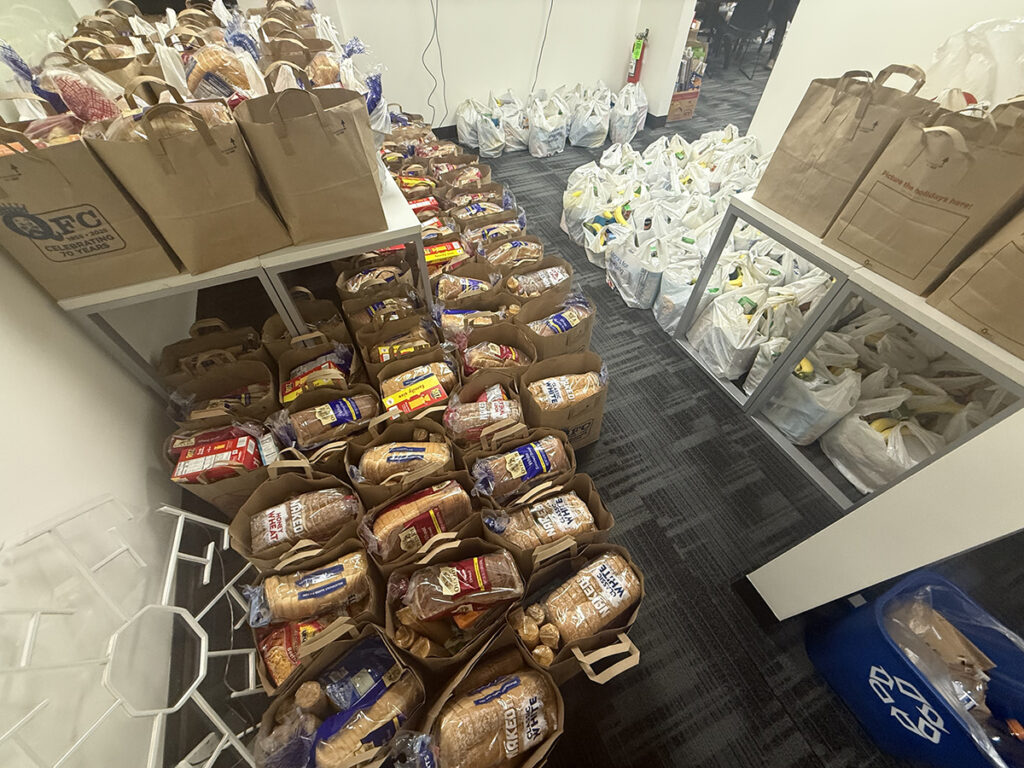 Grocery bags filled with food take up an office space at Inspire Realty (Photo provided by Jesse Le)