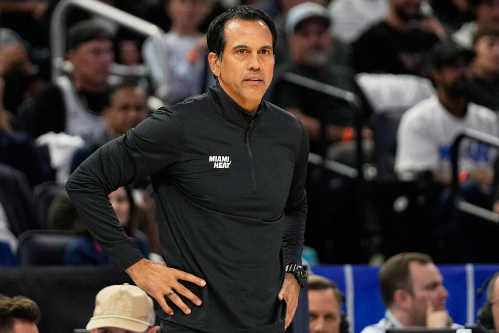 Miami Heat head coach Erik Spoelstra watches his team against the Orlando Magic on Oct. 22, 2025, in Orlando, Fla. (AP Photo/John Raoux)
