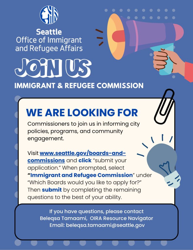The Seattle Office of Immigrant and Refugee Affairs is recruiting members for the Seattle Immigrant and Refugee Commission, a volunteer group that advises the mayor, City Council and city departments on how to better serve residents from around the world who call Seattle home.
