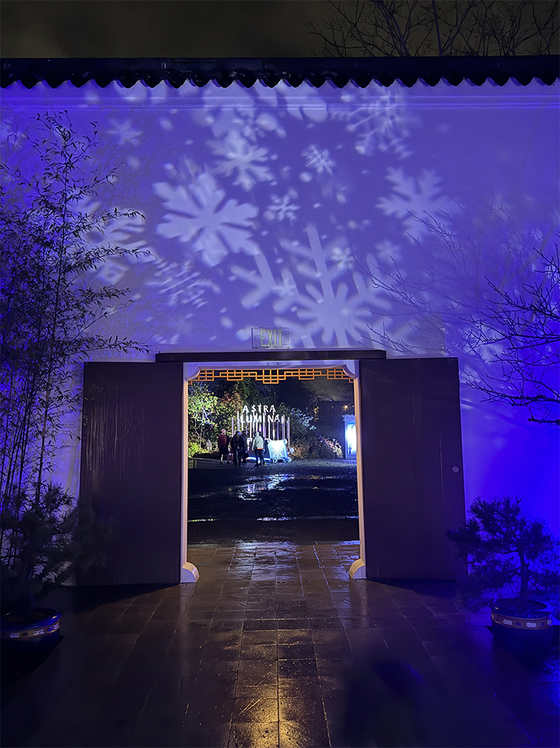 On a cold, rainy winter evening, the Seattle Chinese Garden at South Seattle College transforms into something quietly otherworldly. Lantern-lit pathways glow beneath towering trees, celestial music drifts through the air, and families, couples, and friends move slowly through the darkness—phones raised, eyes wide. This is Astra Lumina, a nighttime installation that turns the garden into a contemplative walk through light, sound, and space.