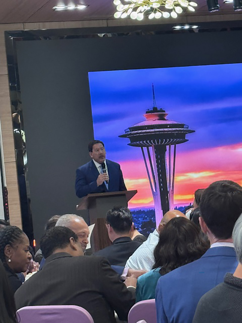 Seattle Councilmember Joy Hollingsworth joked about Harrell’s “strong hairline.” She also marked his accomplishments over his four years, including a housing levy, Comprehensive Plan, transportation improvements, and food access.