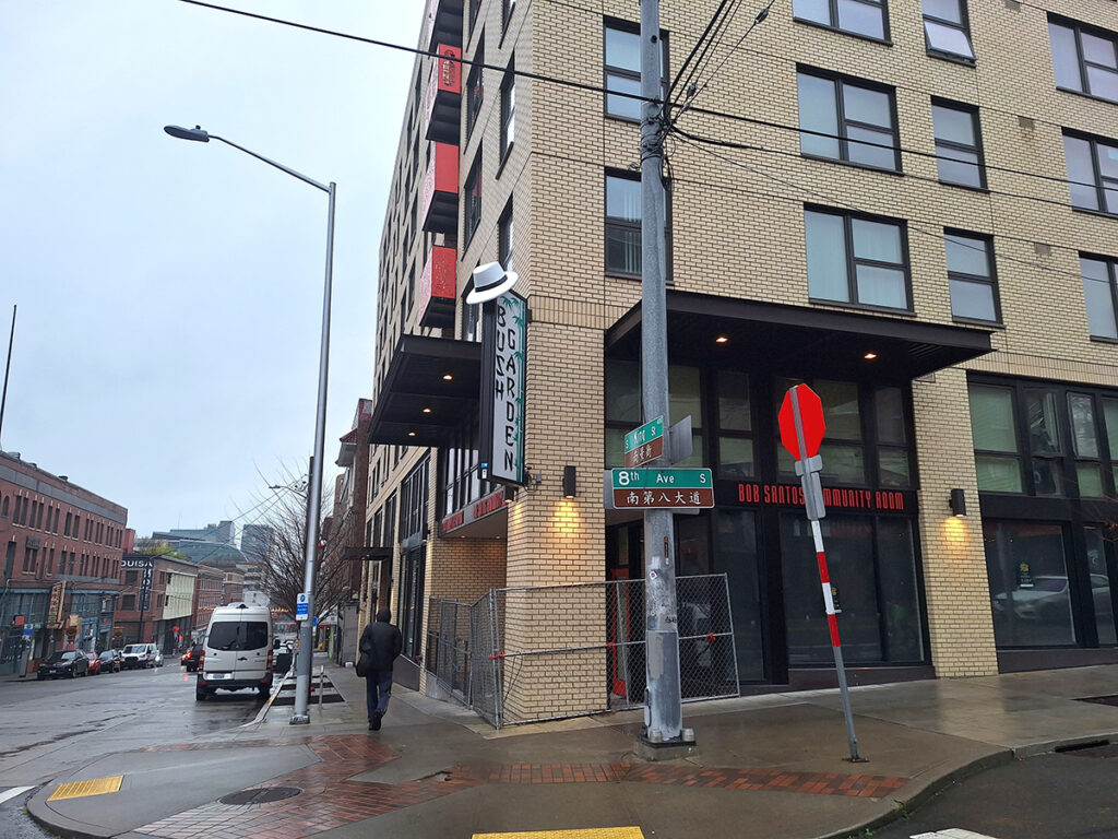 The hat appears similar to one frequently worn by the late Bob Santos, a Seattle civil rights leader and unofficial mayor of the CID.