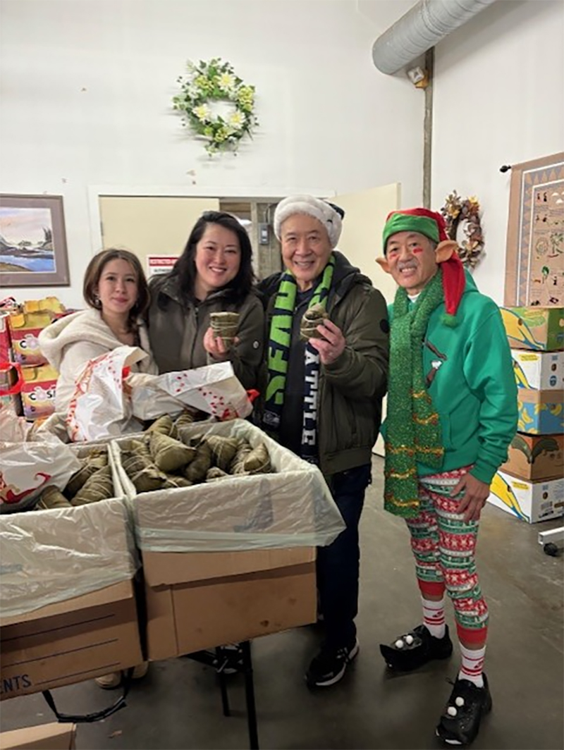Friends and supporters of elderly residents purchased Costco rotisserie chickens and helped package and distribute food. Ton Kiang Barbeque Noodle House prepared sticky rice zongzi to supplement food bank offerings. MarPac Construction supplied portable restrooms, and retired WaFd banker Derek Chin donated red envelopes with lucky money.
