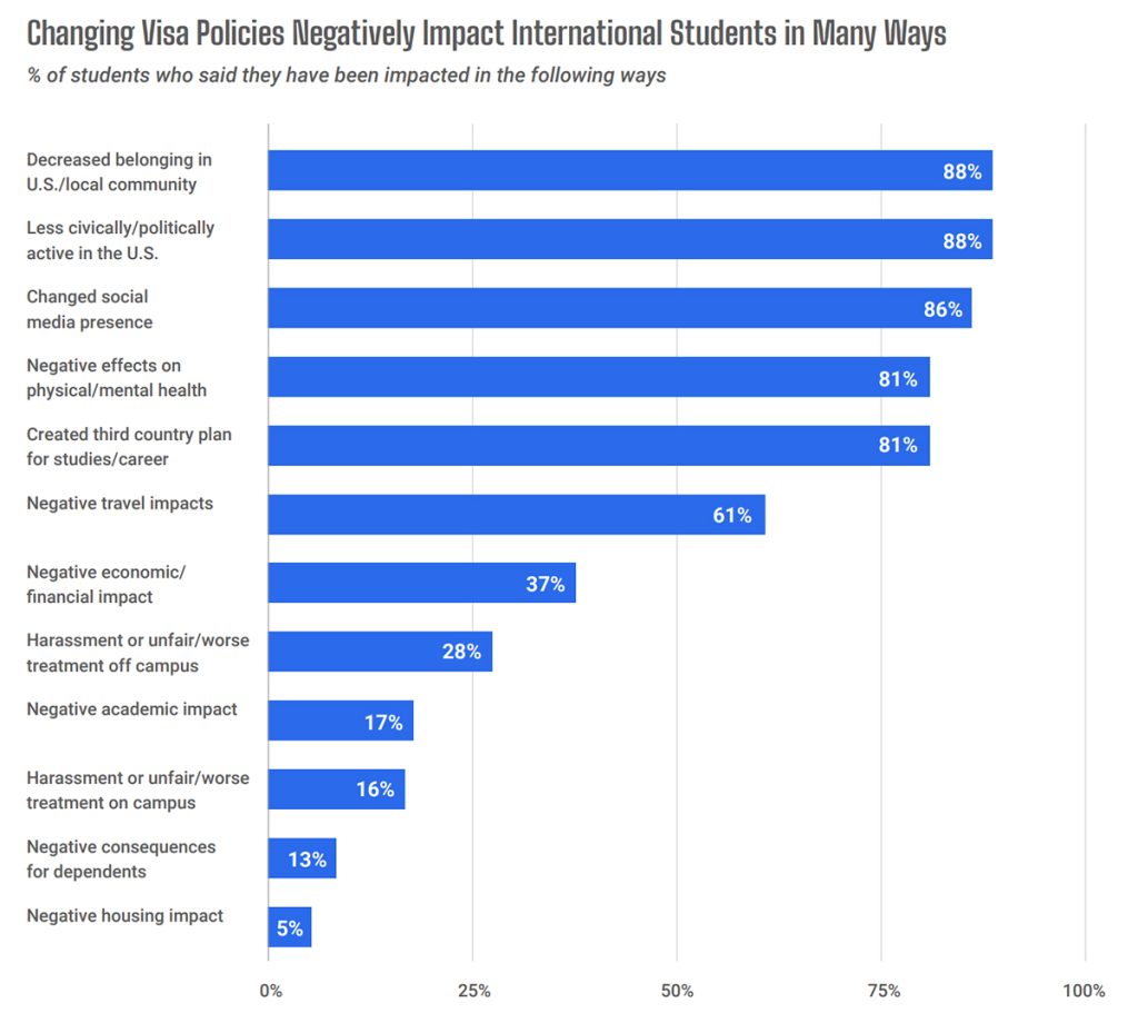 Asian students, who make up 72% of all international students in the United States, described feeling increasingly targeted through shifting visa rules, surveillance concerns and what they view as a hostile political climate. Ninety percent reported a decreased sense of belonging, while 78% said the current environment has harmed their physical or mental health.