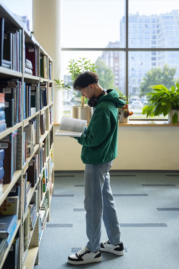 A student reads a book in a library