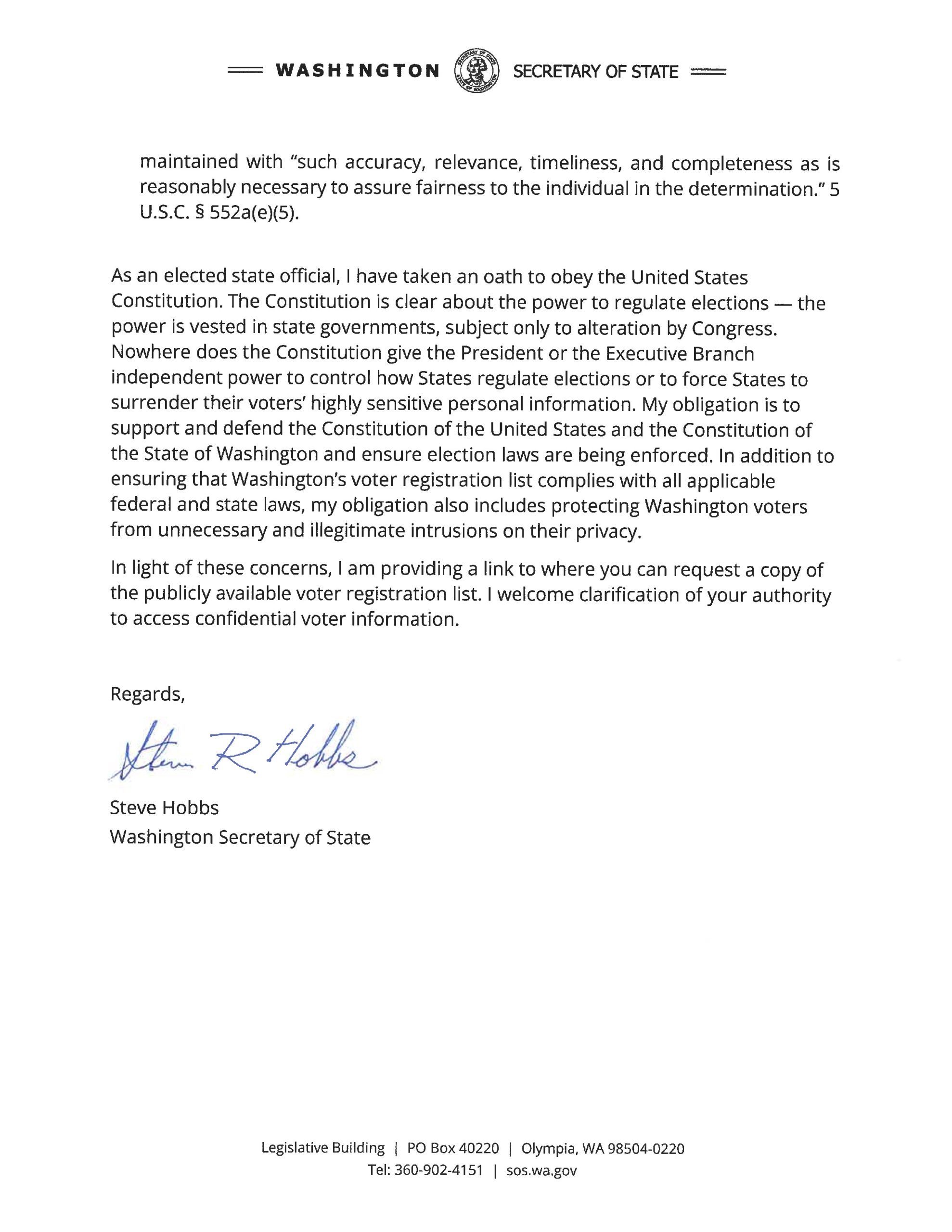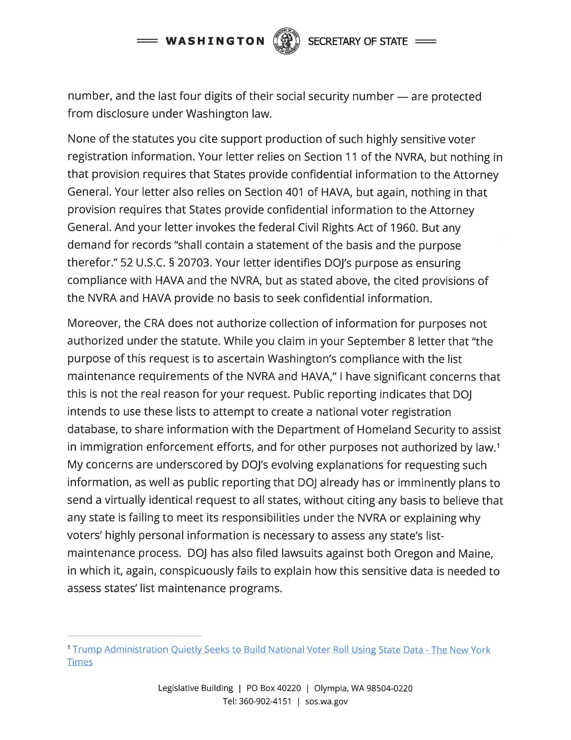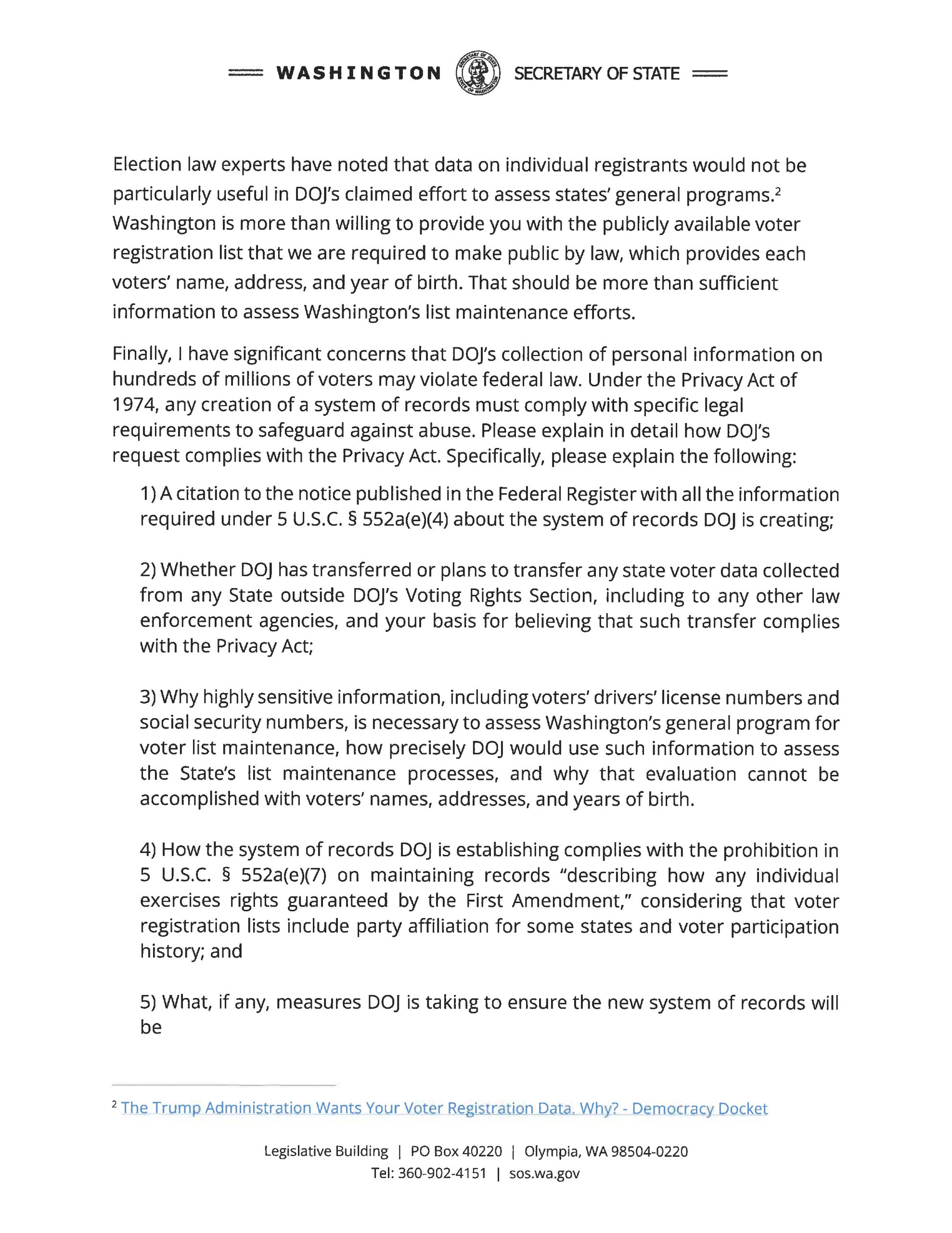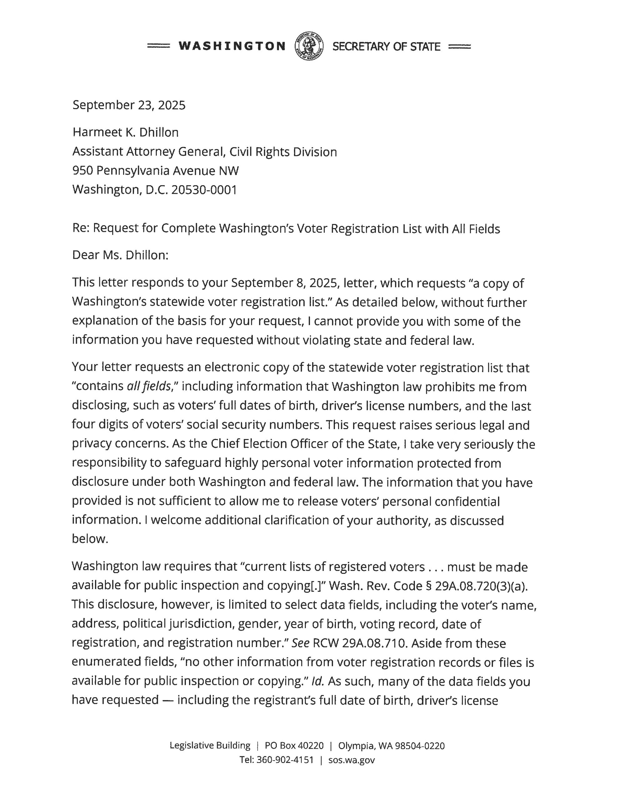 In his formal response, Hobbs wrote to Assistant Attorney General Harmeet K. Dhillon that the DOJ hadn’t offered enough legal justification for its request. Under state law, he reminded the department, only certain details—such as a voter’s name, address, year of birth and voting history—can be made public. “Aside from these enumerated fields, ‘no other information from voter registration records or files is available for public inspection or copying,’” he noted, quoting Washington statute.