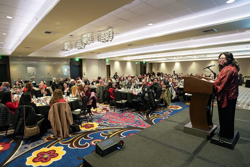 ICHS CEO Kelli Nomura speaks on stage at ICHS’ 2025 Healthcare for All Benefit Lunar New Year luncheon. The event brought in nearly 300 attendees, all rallying around ICHS’ commitment to advocate for health as a human right. (Photo provided by ICHS)