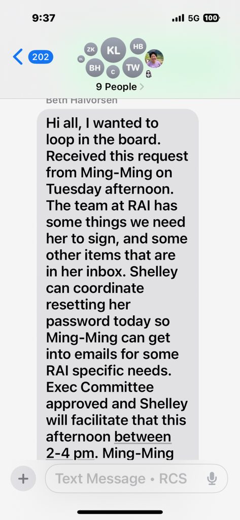 Tung-Edelman shared group text messages from Dec. 4, 2025 that board members sent her. These text messages show that RAI’s interim CEO Beth Halvorsen told Tung-Edelman that the board would grant her two-hour access to sign a crucial funding document as executive director, even though they had removed her from her post. It was a contract concerning a $150,000 grant from the City of Seattle.