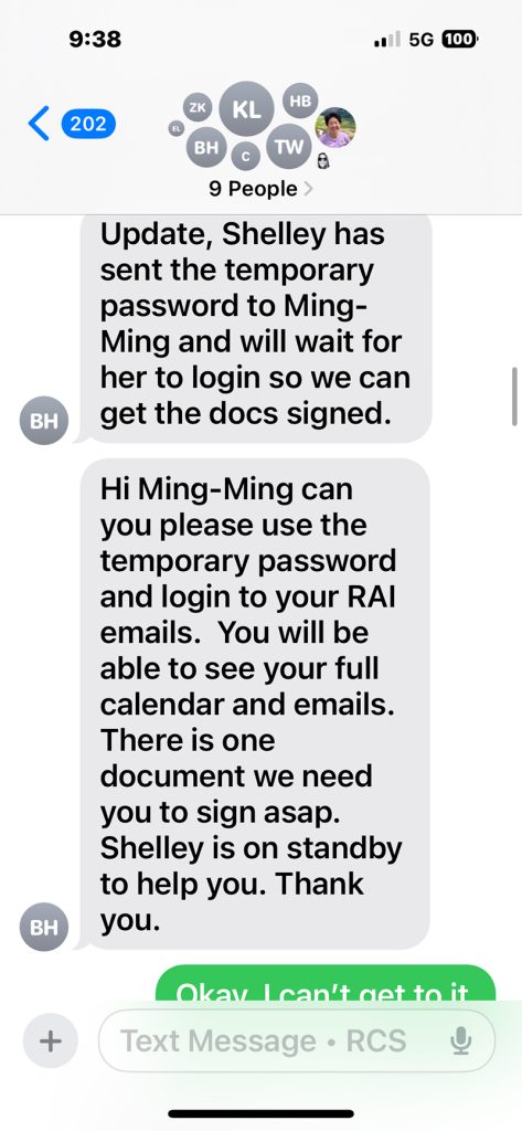 In a later text, Halvorsen asks Tung-Edelman to “please use the temporary password and login to your RAI emails. … There is one document we need you to sign asap.”