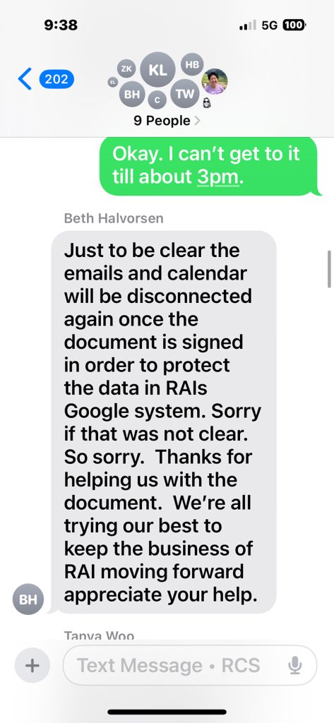 Tung-Edelman said in the group chat that she would not be able to get to it until 3 p.m. that day. Halvorsen replied, “Just to be clear the emails and calendar will be disconnected again once the document is signed in order to protect the data in RAIs Google system.”