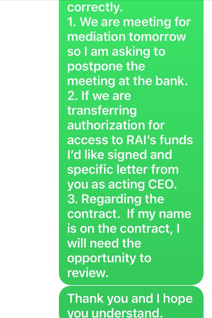 Tung-Edelman replied that because the group would be meeting for mediation the following day that they “postpone the meeting at the bank.” She also requested that if the board would be transferring authorization for access to RAI’s funds, that she receive a signed letter from Halvorsen as acting CEO. Finally, she said, “Regarding the contract. If my name is on the contract, I will need the opportunity to review.”