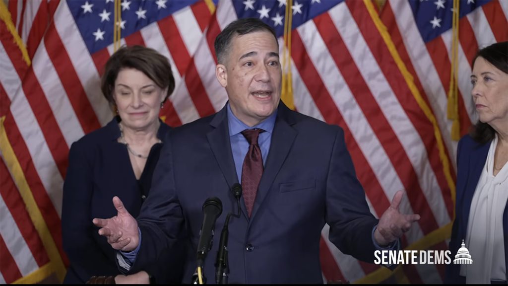 Several Democratic senators and their guests, including Washington Secretary of State Steve Hobbs, spoke out against President Donald Trump’s policies and Republicans’ pending legislative actions in advance of Trump’s State of the Union address at a press conference in Washington, D.C., on Feb. 24.