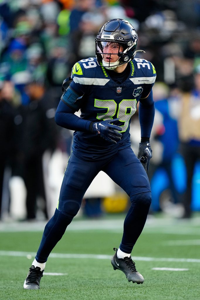 Seattle Seahawks safety Ty Okada (39) gets set during the NFC Championship NFL football game, Sunday, Jan. 25, 2026, in Seattle. (AP Photo/Ben VanHouten)