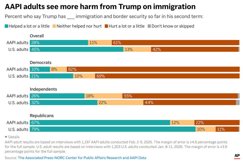 WASHINGTON (AP) — Most Asian Americans, Native Hawaiians and Pacific Islanders believe President Donald Trump has done more harm than good on the issue of immigration and border security in his second term so far, according to a new AAPI Data/AP-NORC poll.