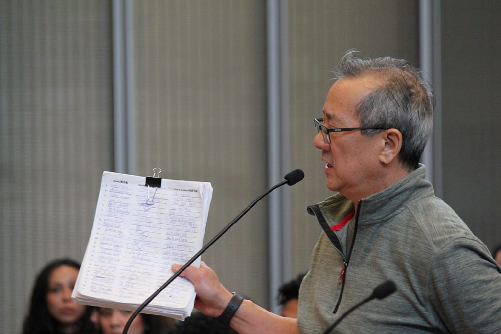 Gary Lee, co-chair of the Chinatown-International District Public Safety Council, presents the petition to the Seattle City Council. (Photo by James Tabafunda)