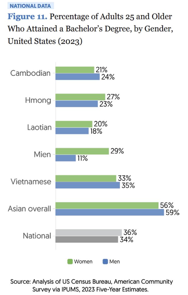 The report notes, for instance, that nationally, women 25 and older in “Hmong, Laotian, and Iu Mien communities have higher rates of bachelor’s degree completion than men. In Cambodian and Vietnamese communities, however, men aged 25 and older are more likely to have completed a bachelor’s degree.”