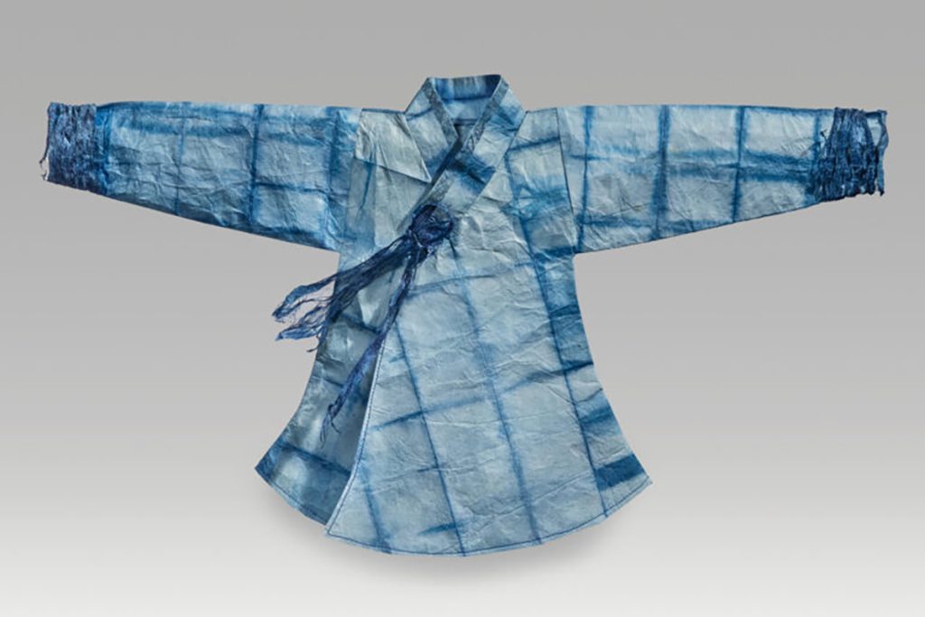 “In the process of texturing and fusing … you have to crumple up the paper, massage it, throw it around, and really work it in a way that it changes the nature of it, but because of the long fibers, they can flex, rather than tearing. It causes a shift in being a crisp sheet of paper to more pliant, draping, almost like fabric, in the way that Koreans have been, for centuries, people have tried to eradicate them, or enslave them. … It just makes them stronger. It’s forced them to create other ways of surviving.”