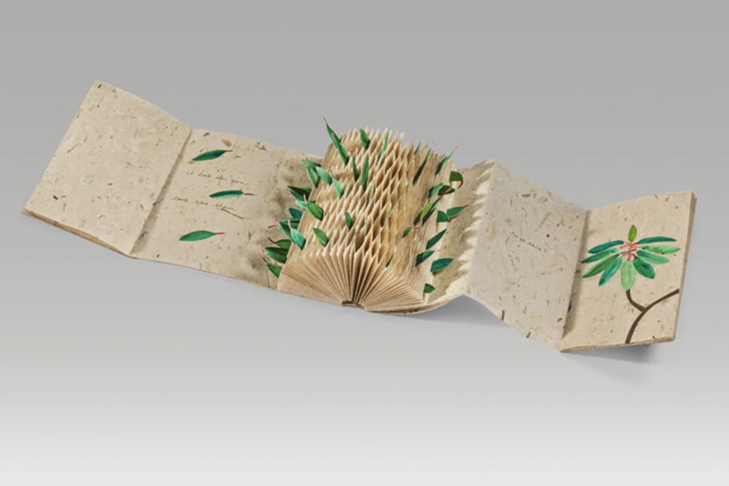 Aimee Lee, Unity, 2024, Acrylic on paper, pen on milkweed bast hanji, 8.75 x 5.1 x 1.75” closed, 11” wide open (Courtesy of Aimee Lee)