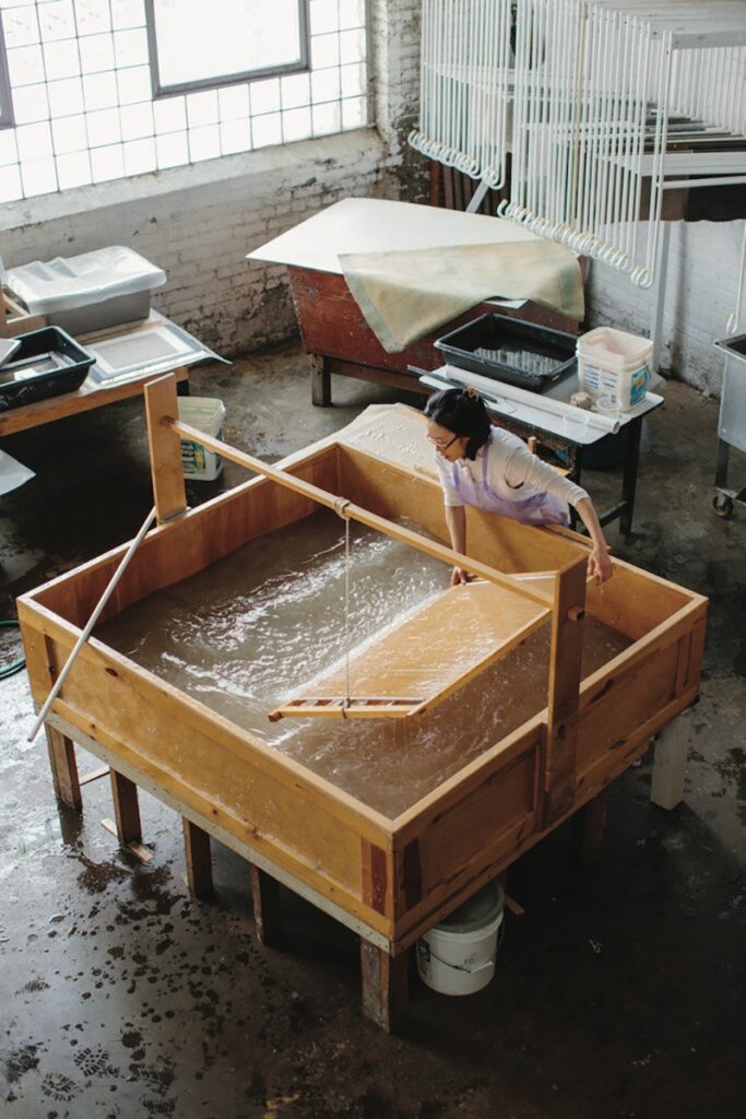“You would dig up the roots … and then you’d freeze them and … the day before you make paper, pound those, and then soak them in very cold water and then they will lose this mucilage,” Lee explained. “And then you’d have to strain that out a couple times and then that would be what goes into the vat. And then at that point, you have your bamboo screen in a wooden frame that it sits on top of that suspended over the vat and you’d pass that through the slurry several times.”