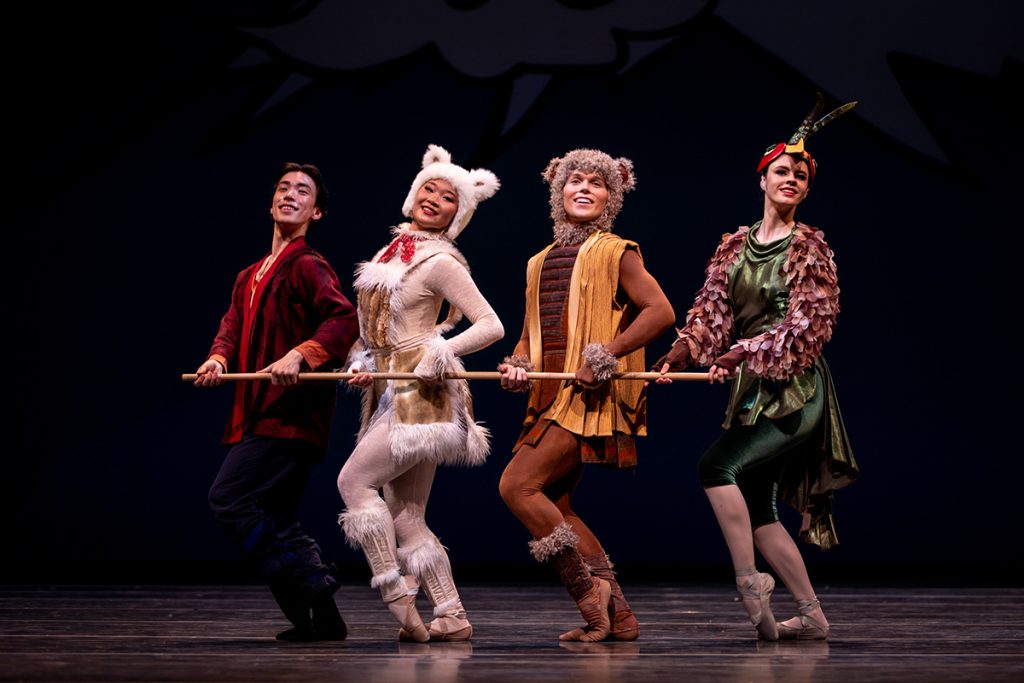 Pacific Northwest Ballet School Professional Division students. From left: Christopher Karhunen (Momotaro), Evelyn Pak (Dog), Landon Spurbeck (Monkey), and Tess Fein (Pheasant) in the world premiere production of Jessica Lang’s Momotaro. (Photo © Lindsay Thomas.)