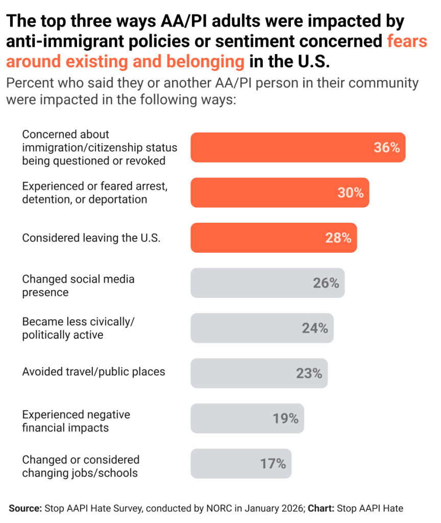 In a national survey conducted in January with researchers at NORC at the University of Chicago, 53% of AAPI adults said they or someone in their community had been affected by anti-immigrant policies or sentiment in the past year.