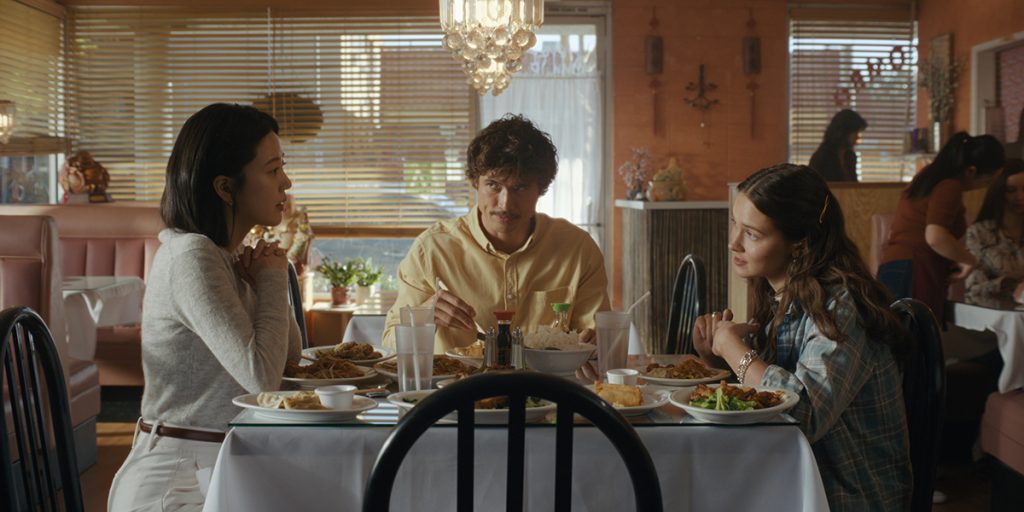 The culture clash comes out over Chinese food. (From left) Seoyeon Jang as Eunice, Charles Melton as Austin Davis, and Cailee Spaeny as Ashley Miller (Courtesy: Netflix © 2026)