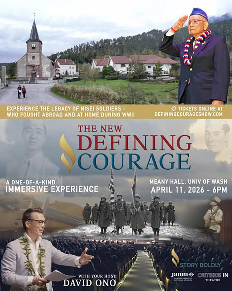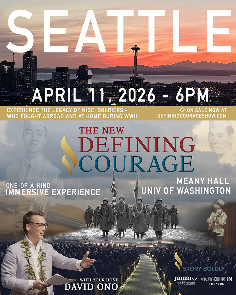 “Defining Courage” comes to Seattle on April 11. Do not let the fact that the venue is on campus at the University of Washington (UW)’s Meany Hall give you the wrong idea. This is not a lecture. But it is history. This is not a documentary. But it will show you true stories and places that were part of the Nisei soldier experience during the war. According to Ono, an Emmy award-winning film maker and news anchor at ABC7-Los Angeles, “Defining Courage” is part-journalism, part-entertainment, and part-theater. To those involved, it is a necessity in the mission to ensure we don’t forget the bravery of those men, nor the Japanese immigration experience.