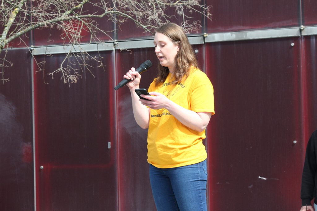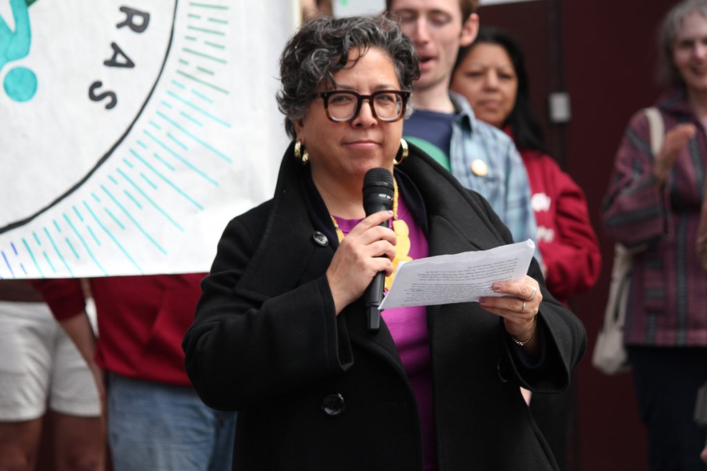 Melissa Howard, Community Not Cameras rally emcee and Our Seattle member (Photo by James Tabafunda)