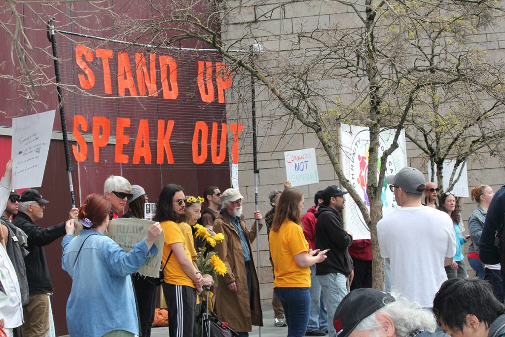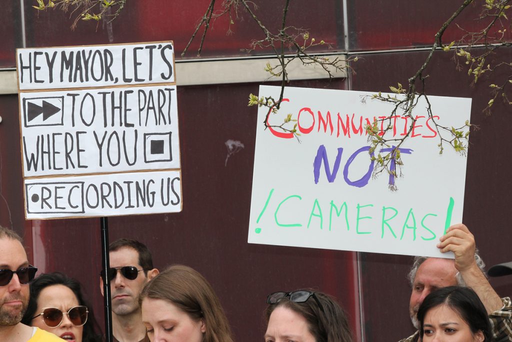 “No surveillance expansion,” the crowd chanted. “Turn the cameras off.”