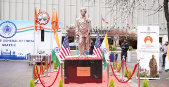 A statue of Swami Vivekananda, the Indian spiritual leader who introduced Vedanta Hinduism and yoga to the West, was unveiled at Seattle’s Westlake Park on Saturday, April 11.