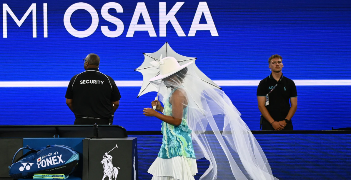A statement of confidence as much as style, Naomi Osaka walked onto one of the biggest stages in tennis wearing a wide-brim hat, a veil and holding a white parasol in a bold opening act at the Australian Open.